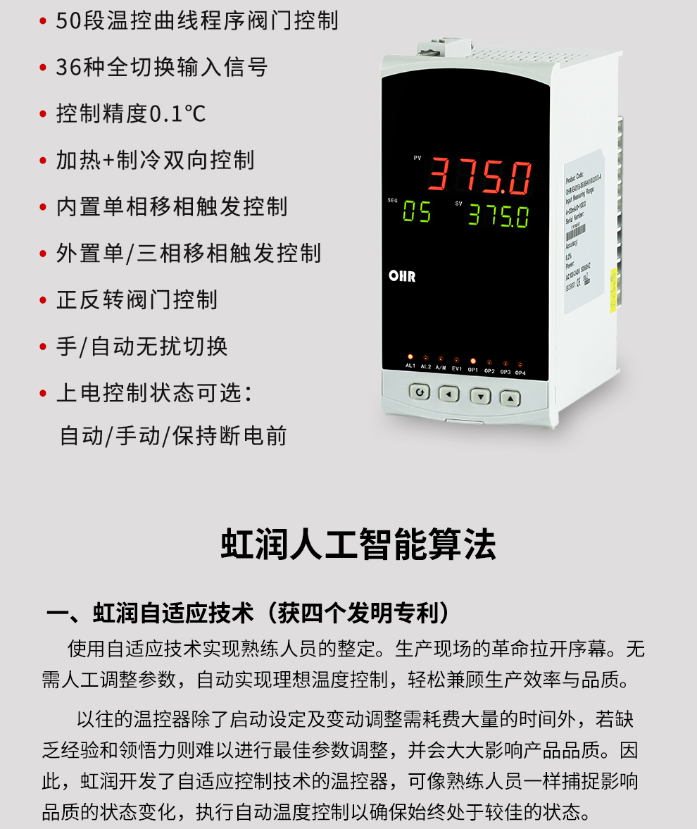 OHR-E401系列程序閥門溫控器/調(diào)節(jié)儀采用真正的人工智能算式,儀表啟動自整定功能,可以根據(jù)被控對象的特性,自動尋找最優(yōu)參數(shù)以達到很好的控制效果,無需人工整定參數(shù)??販鼐然具_±0.1℃,無超調(diào)、欠調(diào),達國際先進水平。
