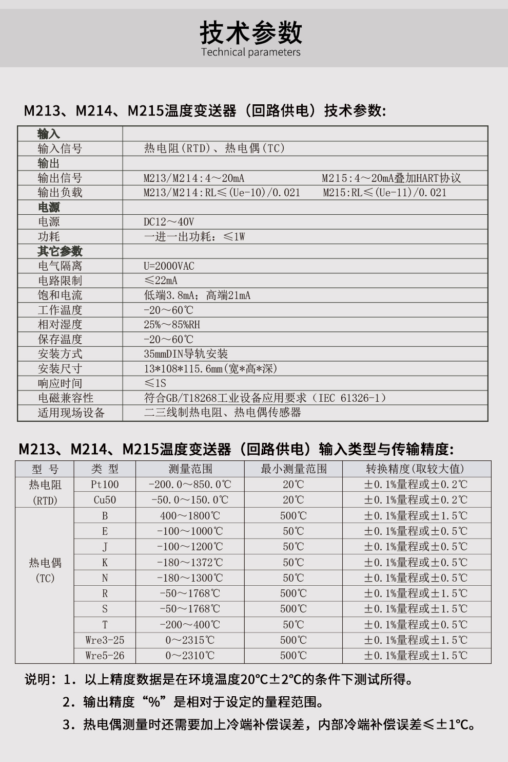 回路供電溫度變送器分為M213智能溫度變送器、M214隔離智能溫度變送器、M215 HART智能溫度變送器,變送器將現(xiàn)場的熱電阻或熱電偶信號經(jīng)過隔離放大處理,轉(zhuǎn)換為與溫度成線性的二線制4-20mA(HART)信號輸出至控制系統(tǒng)。