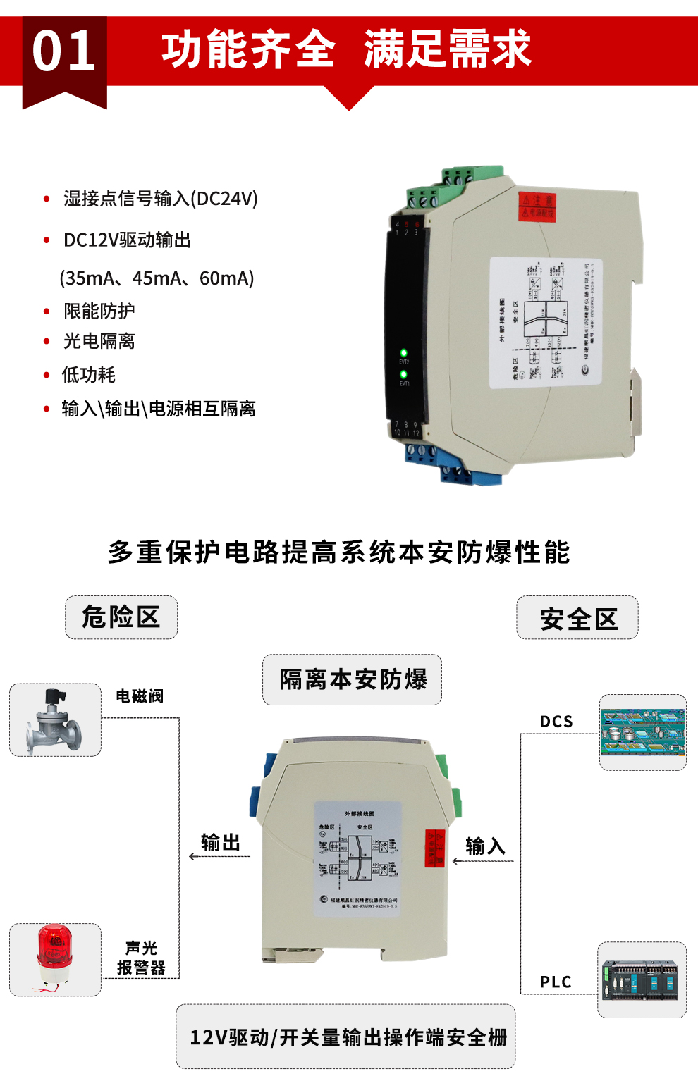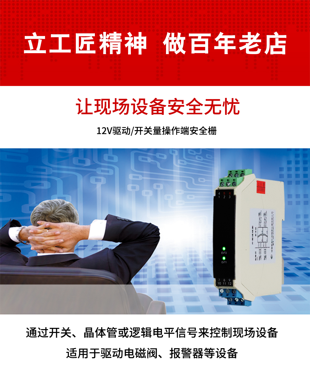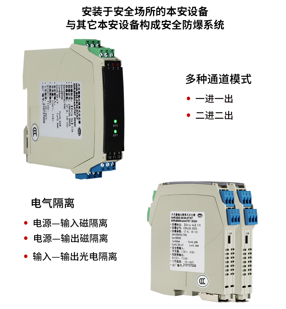 OHR-B35系列12V驅(qū)動(dòng),開關(guān)量輸出操作端隔離柵將安全區(qū)的電源通過開關(guān)控制,驅(qū)動(dòng)危險(xiǎn)區(qū)的現(xiàn)場(chǎng)本安設(shè)備,它允許控制開關(guān)直接連接到24V供電回路的任一端。本產(chǎn)品適用于驅(qū)動(dòng)如電磁閥、聲光報(bào)警等本安設(shè)備。